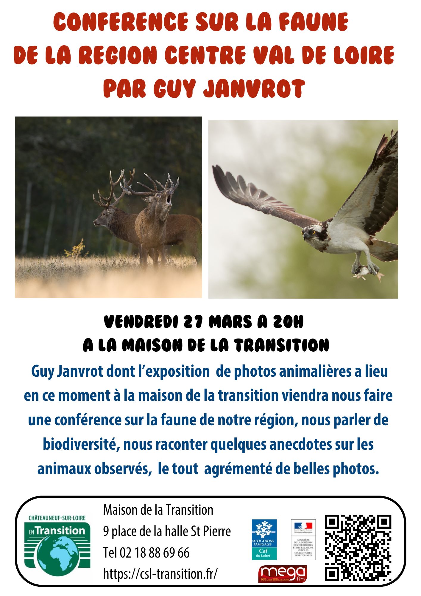 En parallèle de l’exposition dans le café, Guy Janvrot donnera une conférence à la maison de la transition pour parler de biodiversité, raconter des anecdotes sur les animaux observés… Vendredi 27 mars à 20h